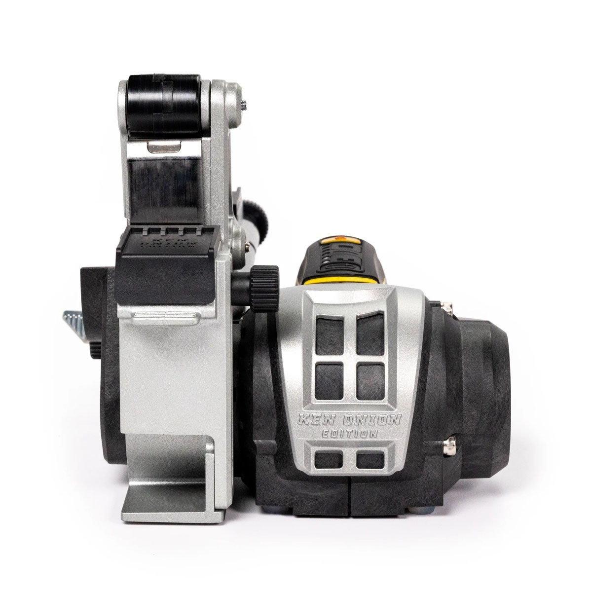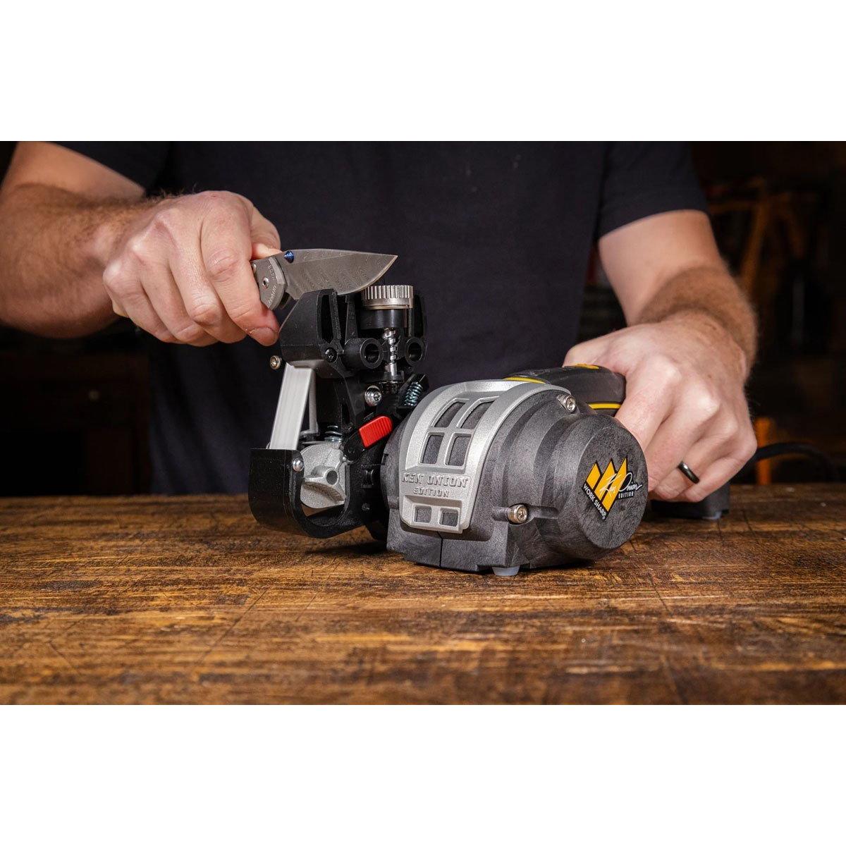 Experience precision and speed with the Ken Onion Edition Knife & Tool Sharpener Mk.2™, designed for edge enthusiasts and knife collectors alike. Specially designed flexible abrasive belts and electronic speed control delivers professional-level sharpening results quickly and consistently. This sharpener ensures precision, incredibly keen edges, and fast results with its premium abrasive belt selection and leather-lined sharpening guides. Sharpen pocket knives, outdoor blades, kitchen knives, scissors, and a wide range of lawn and garden tools like axes, mower blades, and pruners. Developed in partnership with knife-making legend Ken Onion, this sharpener brings the proven technology used by professionals straight to your home or shop.