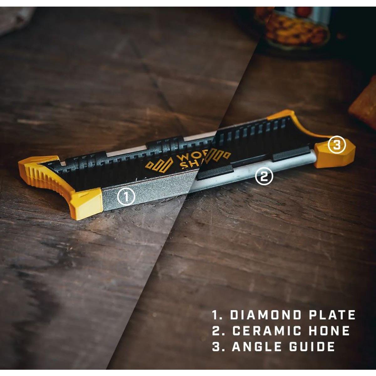 The Pocket Knife Sharpener is a compact, packable knife sharpener designed for sharpening on the go. The diamond sharpening plate and ceramic honing rod use built-in angle guides to create a sharp edge anytime, anywhere.