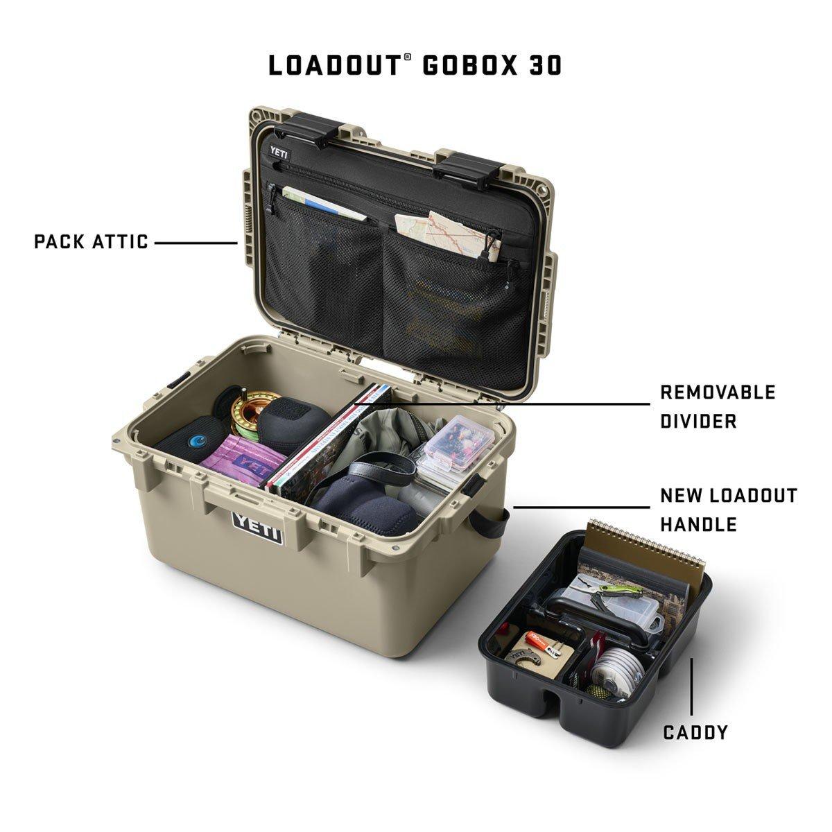The YETI LoadOut® GoBox 30 Gear Case is built to take on even the toughest adventures. The GoBox 30 is designed to withstand serious impact and meets IP65 and IP67 ratings to be dustproof and fully submersible, keeping your gear protected from whatever you throw at it. The box includes a cargo tray, divider, and Pack Attic™ gear compartment to keep everything organized and accessible. Plus, the LoadOut® GoBox 30 has classic YETI design features like the NeverFail™ Hinge System, LipGrip™ Handles, and Lockdown Latches to create a virtually indestructible but incredibly convenient case for all your gear. Take on your adventure with the YETI LoadOut® GoBox 30 Gear Case—what goes in here can go anywhere.