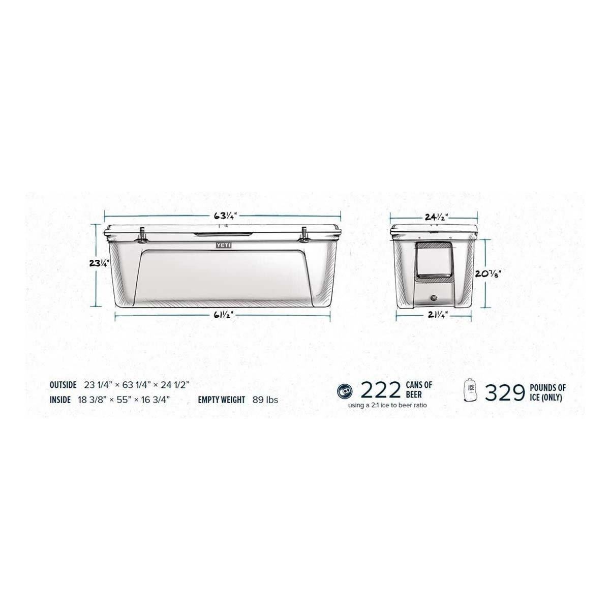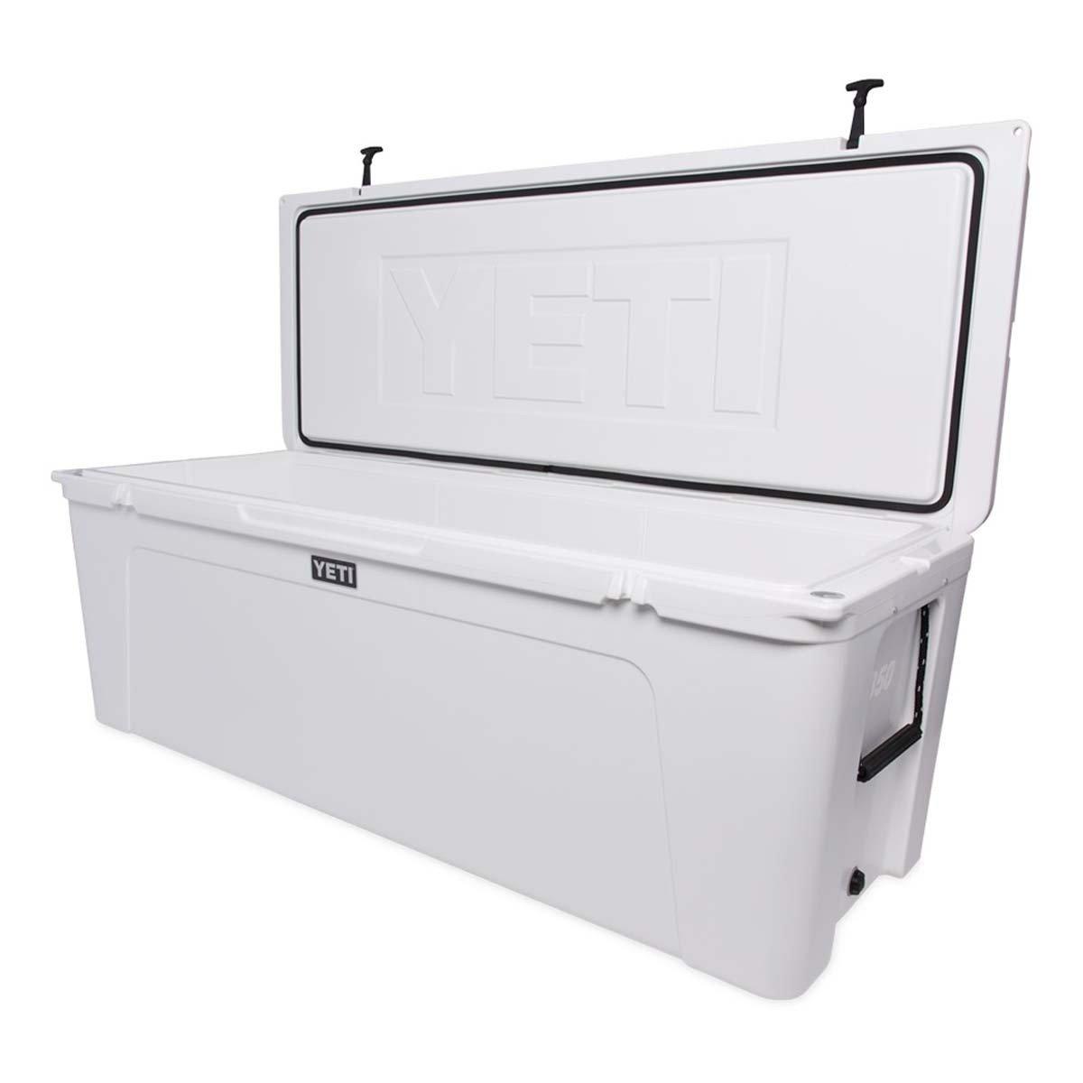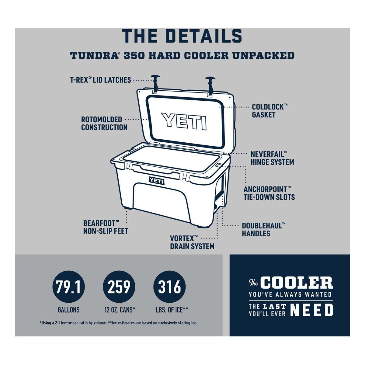 The Tundra® 350 is YETI's largest cooler. With a whopping 19 000 cubic inches of capacity and enough space to hold 82.4 gallons it's built to handle big events and deep sea catches. The Tundra 350 is engineered tough from one piece of rotomolded polyethelyne so it'll last you for a lifetime. And its Permafrost™ Insulation No Sweat™ Design and self-stopping hinges make storing your hauls and hunts easy. Keep your contents colder longer with the Tundra 350.
