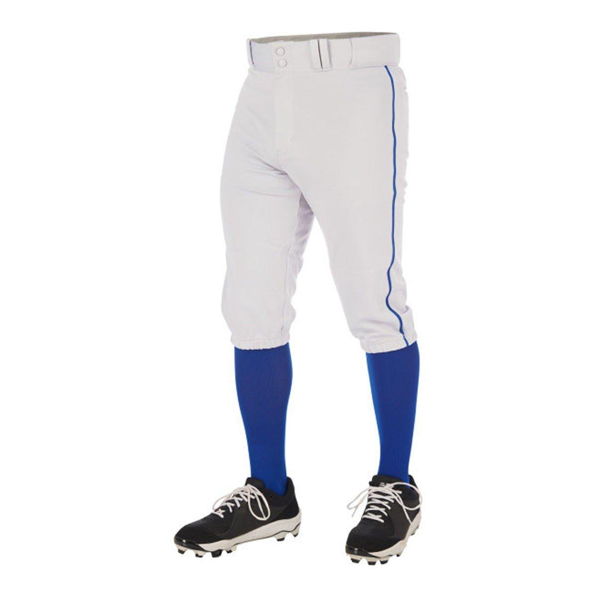 The popular CHAMPRO Triple Crown baseball pants series has been redesigned to create the Triple Crown 2.0. The result is these updated knicker-cut baseball pants, which have a modern fit through the tapered leg for a more tailored fit and look. They’re made of 100% highly abrasion-resistant TEK-KNIT polyester; 14 oz. pro-weight fabric that allows four-way stretch and adapts to the wearer’s movements. A sliding seat and knees reinforced with double-ply fabric create a more durable pant that withstands sliding action and lasts longer through the season. The 2.5” knit waistband includes Super-Grip Gel strips that keep jerseys tucked in. The 7 pro-style tunnel belt loops allow athletes to easily slide their belt in and secure their uniform in place. Two inset back pockets allow athletes to carry small accessories, such as batting gloves. Available in Adult sizes S-4XL and Youth sizes XS-XL in 8 colors - grey, and white, each with black, navy, royal, or scarlet braid.