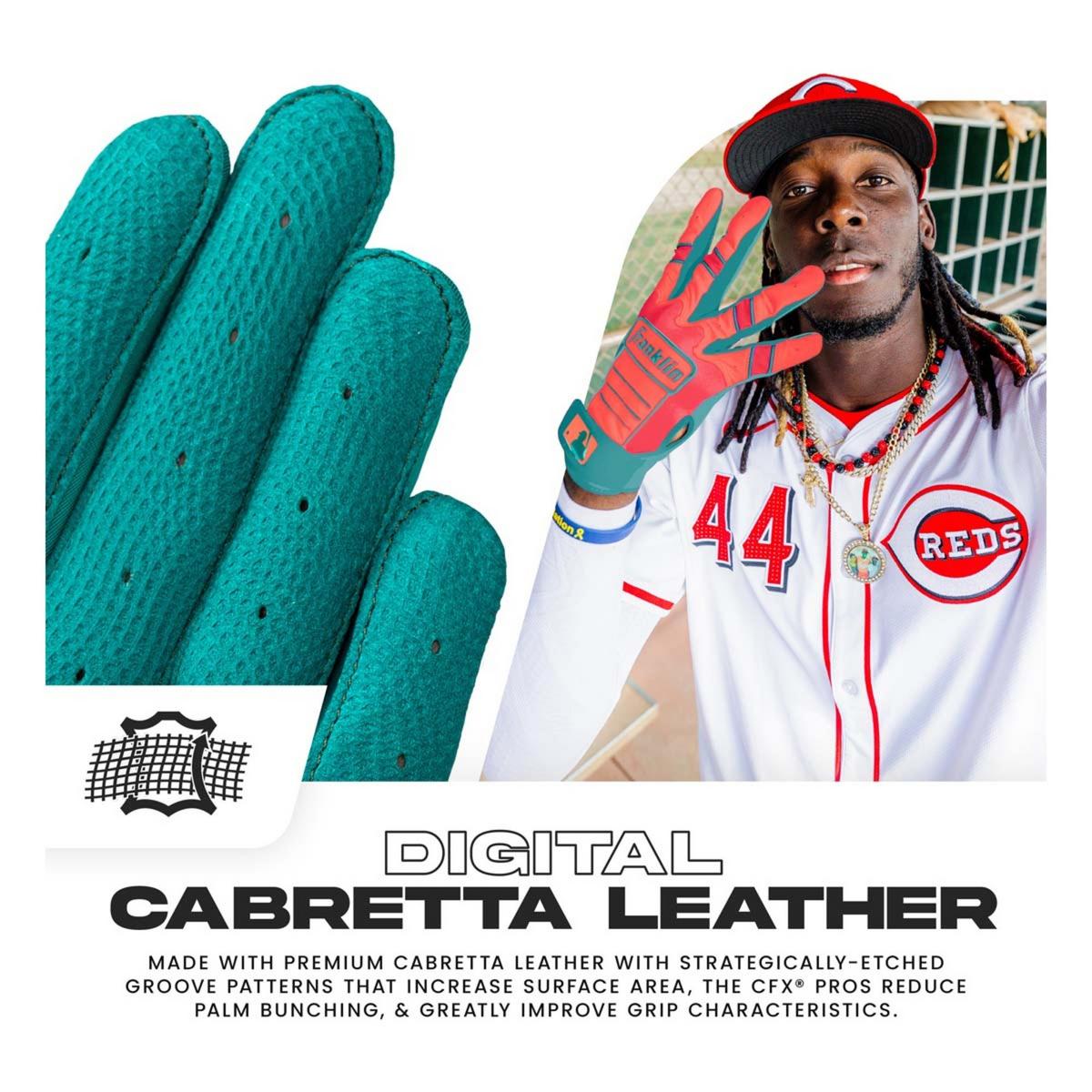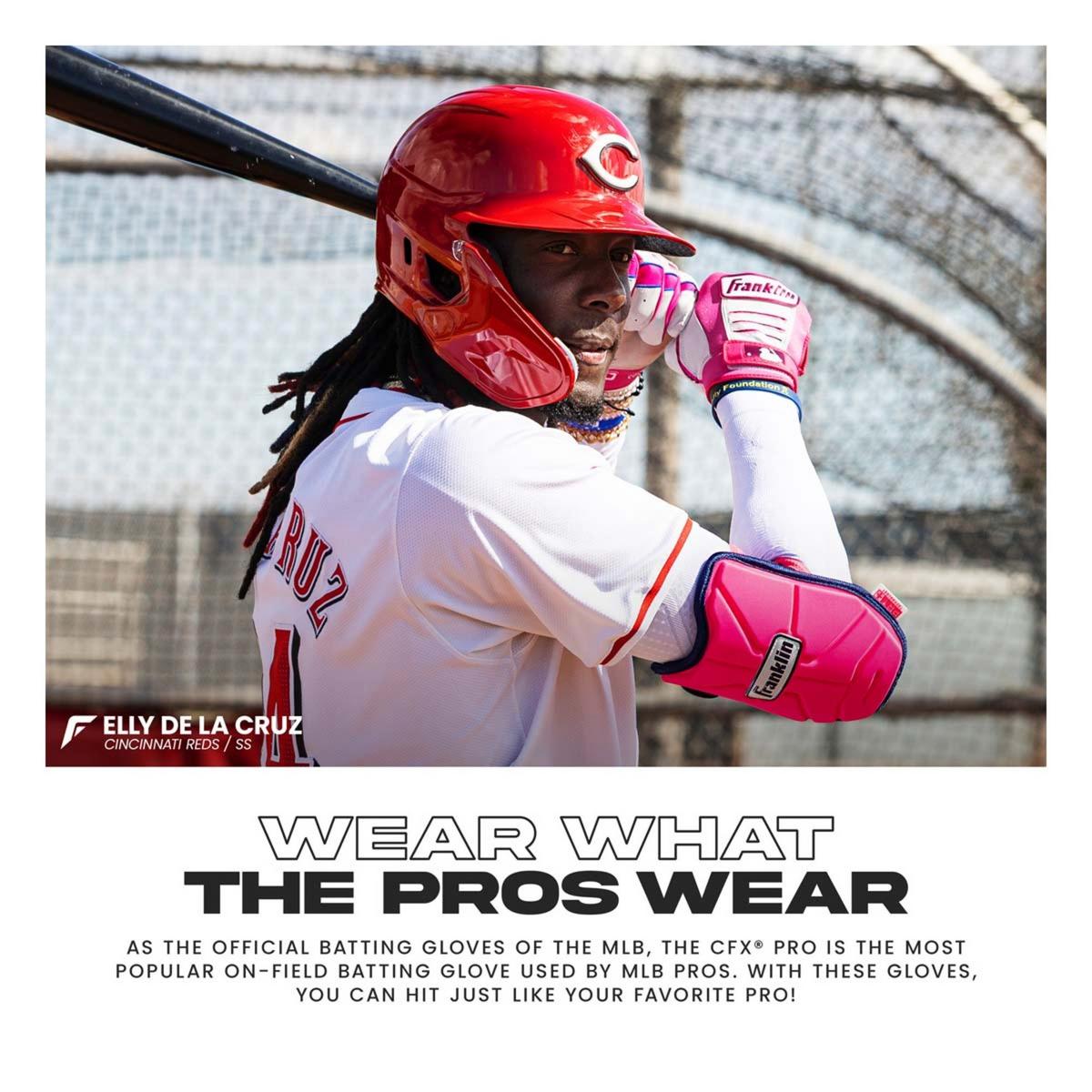 As the official batting gloves of the MLB, the CFX(R) Pro is the most popular on field batting glove used by MLB pros. Constructed with premium quality cabretta leather, these batting gloves are built to last season after season for baseball and softball players of all ages. Designed to fit the natural curves of your hand, these adult and youth batting gloves are made to fit comfortably without bunching or tearing. Tectonic inserts in the handback help these batting gloves maintain flexibility for a snug and flexible fit. The rugged leather palm helps players maintain grip on the bat in all weather conditions for increased bat control and superior performance. These batting gloves are the standard for baseball and softball players at the highest levels. Play like the pros this season and grab yourself a pair of Franklin Sports CFX(R) Pro batting gloves today!