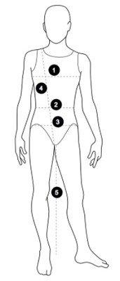 Take the torso measurement from the center of the shoulder, down the torso, through legs, and back to the shoulder. This is the most important measurement you will take when measuring athletes for leotards, men's gymnastics competition shirts, and one piece cheer uniforms.