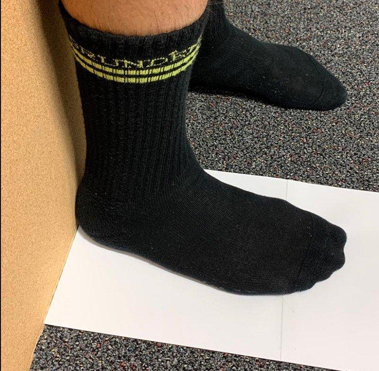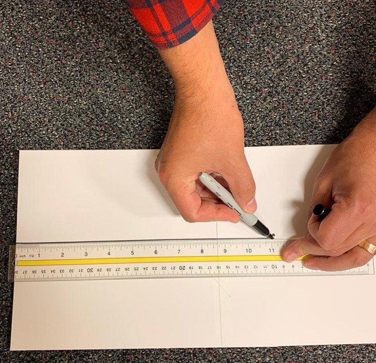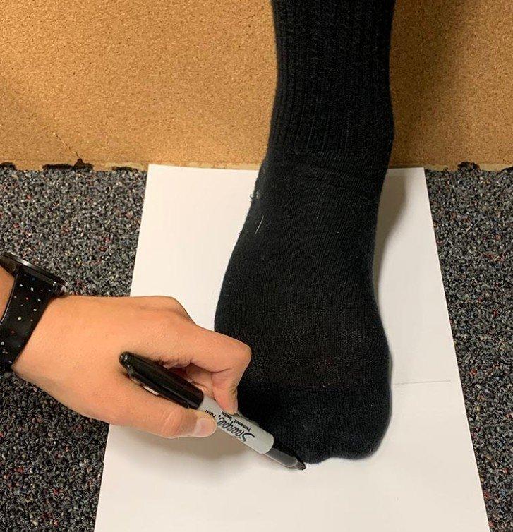 Take two pieces of 8.5X11 paper and tape them together, so the total length is 22”. Stand up straight on a hard surface with the back of your foot against a wall and a piece of blank paper taped to the floor, flush against the wall beneath your foot.