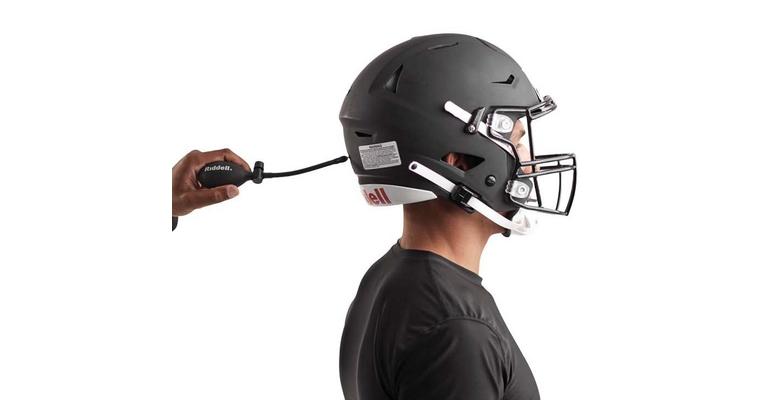 Ensure a proper fit: Interlock hands on top of helmet and press down. Player should feel pressure on crown of head, not brow. Pressure on brow indicates improper fit. Front helmet should be approximately 1" above eyebrows.