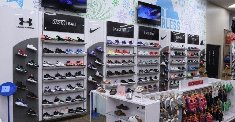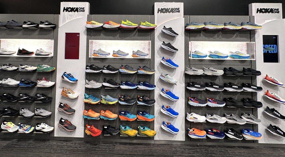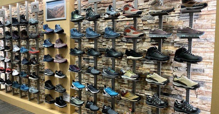 a wall of running shoes within the mens shoe shop at johnstown scheels