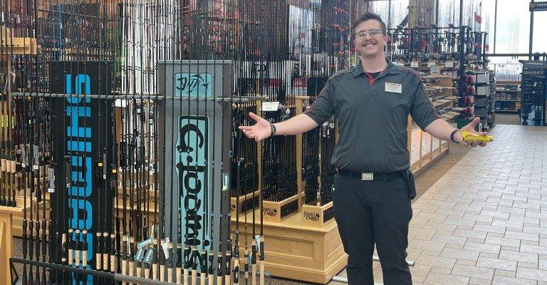 A SCHEELS employee showing a display of fishing rods.