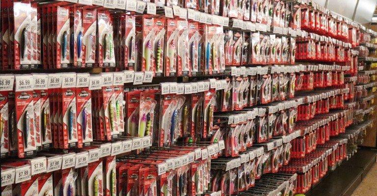 a variety of fishing lures on display at scheels
